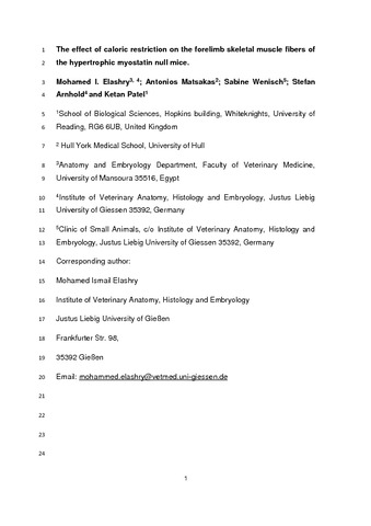 Elashry, M. I., Matsakas, A., Wenisch, S., Arnhold, S. and Patel, K. (2017) The effect of caloric restriction on the forelimb skeletal muscle fibers of 1 the hypertrophic myostatin null mice. Acta Histochemica. ISSN 0065-1281 doi: 10.1016/j.acthis.2017.06.002