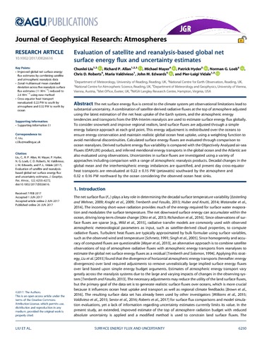 Liu, C., Allan, R. P. orcid id iconORCID: https://orcid.org/0000-0003-0264-9447, Mayer, M., Hyder, P., Loeb, N. G., Roberts, C. D., Valdivieso, M. orcid id iconORCID: https://orcid.org/0000-0002-1738-7016, Edwards, J. M. and Vidale, P. L. orcid id iconORCID: https://orcid.org/0000-0002-1800-8460 (2017) Evaluation of satellite and reanalysis-based global net surface energy flux and uncertainty estimates. Journal of Geophysical Research: Atmospheres, 122 (12). pp. 6250-6272. ISSN 2169-8996 doi: 10.1002/2017JD026616