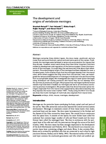 Batarfi, M., Valasek, P., Krejci, E., Huang, R. and Patel, K. (2017) The development and origins of vertebrate meninges. Biological Communications, 62 (2). pp. 73-81. ISSN 2542-2154 doi: 10.21638/11701/spbu03.2017.203