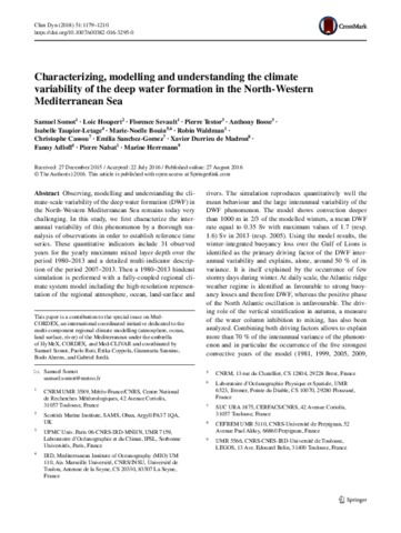 Somot, S., Houpert, L., Sevault, F., Testor, P., Bosse, A., Taupier-Letage, I., Bouin, M.-N., Waldman, R., Cassou, C., Sanchez-Gomez, E., Durrieu de Madron, X., Adloff, F., Nabat, P. and Herrmann, M. (2018) Characterizing, modelling and understanding the climate variability of the deep water formation in the North-Western Mediterranean Sea. Climate Dynamics, 51 (3). pp. 1179-1210. ISSN 0930-7575 doi: 10.1007/s00382-016-3295-0