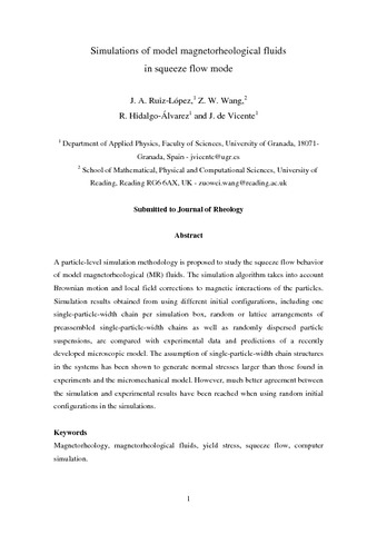 Ruiz-López, J. A., Wang, Z. W., Hidalgo-Álvarez, R. and de Vicente, J. (2017) Simulations of model magnetorheological fluids in squeeze flow mode. Journal of Rheology, 61 (5). pp. 871-881. ISSN 0148-6055 doi: 10.1122/1.4990641