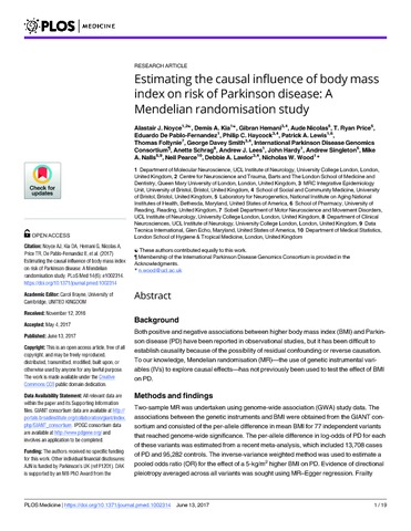 Noyce, A. J., Kia, D. A., Hemani, G., Nicolas, A., Price, T. R., De Pablo-Fernandez, E., Haycock, P. C., Lewis, P. A., Foltynie, T., Davey Smith, G., Schrag, A., Lees, A. J., Hardy, J., Singleton, A., Nalls, M. A., Pearce, N., Lawlor, D. A. and Wood, N. W. (2017) Estimating the causal influence of body mass index on risk of Parkinson disease: a Mendelian randomisation study. PLoS Medicine, 14 (6). e1002314. ISSN 1549-1676 doi: 10.1371/journal.pmed.1002314