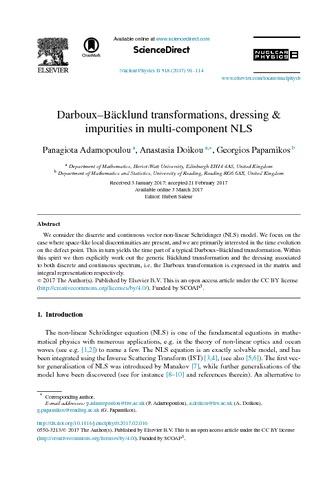 Adamopoulou, P., Doikou, A. and Papamikos, G. (2017) Darboux–Bäcklund transformations, dressing & impurities in multi-component NLS. Nuclear Physics B, 918. pp. 91-114. ISSN 0550-3213 doi: 10.1016/j.nuclphysb.2017.02.016
