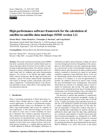 Block, T., Embacher, S., Merchant, C. J. orcid id iconORCID: https://orcid.org/0000-0003-4687-9850 and Donlon, C. (2018) High performance software framework for the calculation of satellite-to-satellite data matchups (MMS version 1.2). Geoscientific Model Development, 11 (6). pp. 2419-2427. ISSN 1991-9603 doi: 10.5194/gmd-11-2419-2018