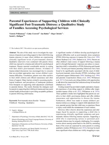Williamson, V., Creswell, C., Butler, I., Christie, H. and Halligan, S. L. (2019) Parental experiences of supporting children with clinically significant post-traumatic distress: a qualitative study of families accessing psychological services. Journal of Child and Adolescent Trauma, 12 (1). pp. 61-72. ISSN 1936-1521 doi: 10.1007/s40653-017-0158-8