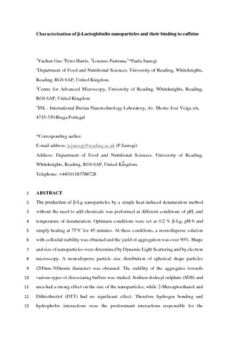 Guo, Y., Harris, P., Kaur, A., Pastrana, L. and Jauregi, P. (2017) Characterisation of β-lactoglobulin nanoparticles and their binding to caffeine. Food Hydrocolloids, 71. pp. 85-93. ISSN 0268-005X doi: 10.1016/j.foodhyd.2017.04.027