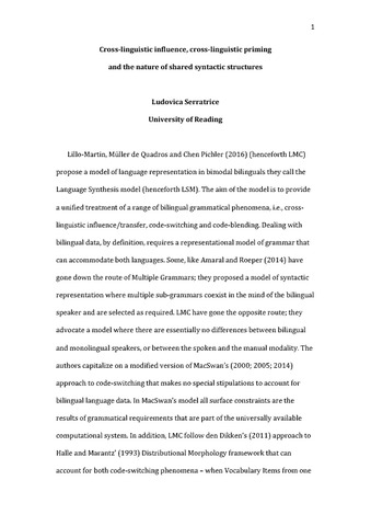 Serratrice, L. orcid id iconORCID: https://orcid.org/0000-0001-5141-6186 (2016) Cross-linguistic influence, cross-linguistic priming and the nature of shared syntactic structures. Linguistic Approaches to Bilingualism, 6 (6). pp. 822-827. ISSN 1879-9264 doi: 10.1075/lab.6.6.15ser