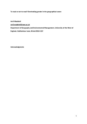 Maddrell, A. orcid id iconORCID: https://orcid.org/0000-0003-2941-498X (2015) To read or not to read? The politics of overlooking gender in the geographical canon. Journal of Historical Geography, 49. pp. 31-38. ISSN 0305-7488 doi: 10.1016/j.jhg.2015.04.013