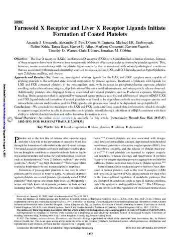Unsworth, A. J., Bye, A. P. orcid id iconORCID: https://orcid.org/0000-0002-2061-2253, Tannetta, D. S., Desborough, M. J. R., Kriek, N., Sage, T., Allan, H. E., Crescente, M., Yaqoob, P. orcid id iconORCID: https://orcid.org/0000-0002-6716-7599, Warner, T. D., Jones, C. I. orcid id iconORCID: https://orcid.org/0000-0001-7537-1509 and Gibbins, J. M. orcid id iconORCID: https://orcid.org/0000-0002-0372-5352 (2017) Farnesoid X receptor and liver X receptor ligands initiate formation of coated platelets. Arteriosclerosis, thrombosis, and vascular biology, 37 (8). pp. 1482-1493. ISSN 1524-4636 doi: 10.1161/ATVBAHA.117.309135