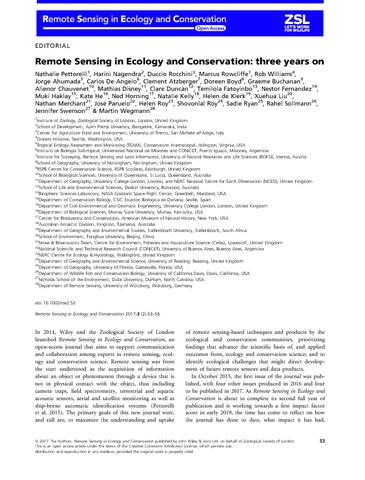 Pettorelli, N., Nagendra, H., Rocchini, D., Rowcliffe, M., Williams, R., Ahumada, J., De Angelo, C., Atzberger, C., Boyd, D., Buchanan, G., Chauvenet, A., Disney, M., Duncan, C., Fatoyinbo, T., Fernandez, N., Haklay, M., He, K., Horning, N., Kelly, N., de Klerk, H., Liu, X., Merchant, N., Paruelo, J., Roy, H., Roy, S. orcid id iconORCID: https://orcid.org/0000-0003-2543-924X, Ryan, S., Sollmann, R., Swenson, J. and Wegmann, M. (2017) Remote sensing in ecology and conservation: three years on. Remote Sensing in Ecology and Conservation, 3 (2). pp. 53-56. ISSN 2056-3485 doi: 10.1002/rse2.53