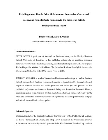 Scott, P. orcid id iconORCID: https://orcid.org/0000-0003-1230-9040 and Walker, J. T. orcid id iconORCID: https://orcid.org/0000-0002-3477-0236 (2018) Retailing under resale price maintenance: economies of scale and scope, and firm strategic response, in the inter-war British retail pharmacy sector. Business History, 60 (6). pp. 807-832. ISSN 1743-7938 doi: 10.1080/00076791.2017.1340455