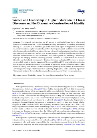 Zhao, J. and Jones, K. orcid id iconORCID: https://orcid.org/0000-0001-5154-4583 (2017) Women and leadership in higher education in China: discourse and the discursive construction of identity. Administrative Sciences, 7 (3). 21. ISSN 2076-3387 doi: 10.3390/admsci7030021