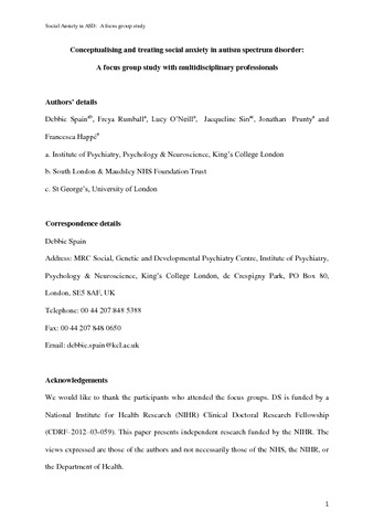 Spain, D., Rumball, F., O'Neill, L., Sin, J., Prunty, J. and Happé, F. (2017) Conceptualizing and treating social anxiety in Autism Spectrum Disorder: a focus group study with multidisciplinary professionals. Journal of Applied Research in Intellectual Disabilities, 30 (S1). pp. 10-21. ISSN 1360-2322 doi: 10.1111/jar.12320
