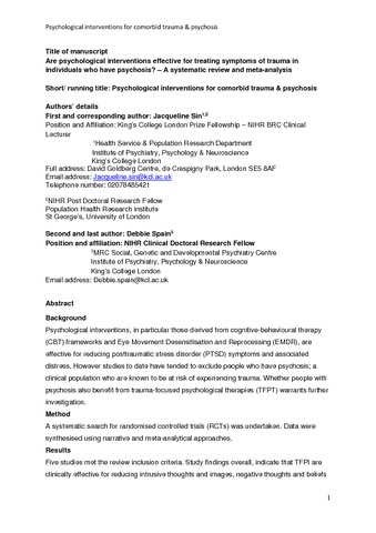 Sin, J. and Spain, D. (2017) Psychological interventions for trauma in individuals who have psychosis: a systematic review and meta-analysis. Psychosis, 9 (1). pp. 67-81. ISSN 1752-2439 doi: 10.1080/17522439.2016.1167946