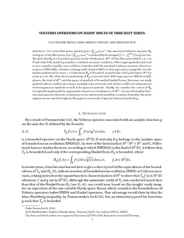 Brevig, O. F., Perfekt, K.-M. and Seip, K. (2019) Volterra operators on Hardy spaces of Dirichlet series. Journal für die reine und angewandte Mathematik (Crelles Journal), 2019 (4). pp. 179-223. ISSN 0075-4102 doi: 10.1515/crelle-2016-0069