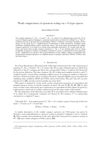 Perfekt, K.-M. (2015) Weak compactness of operators acting on o–O type spaces. Bulletin of the London Mathematical Society, 47 (4). pp. 677-685. ISSN 0024-6093 doi: 10.1112/blms/bdv031