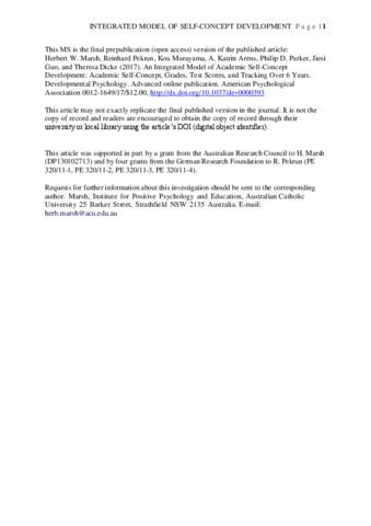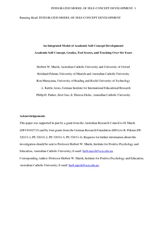 Marsh, H. W., Pekrun, R., Murayama, K., Arens, K. A., Parker, P. D., Guo, J. and Dicke, T. (2018) An integrated model of academic self-concept development: academic self-concept, grades, test scores, and tracking over six years. Developmental Psychology, 54 (2). pp. 263-280. ISSN 0012-1649 doi: 10.1037/dev0000393