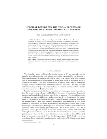 Perfekt, K.-M. and Putinar, M. (2014) Spectral bounds for the Neumann-Poincaré operator on planar domains with corners. Journal d'Analyse Mathématique, 124 (1). pp. 39-57. ISSN 0021-7670 doi: 10.1007/s11854-014-0026-5