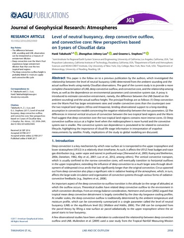 Takahashi, H., Luo, Z. J. and Stephens, G. L. (2017) Level of neutral buoyancy, deep convective outflow, and convective core: new perspectives based on 5 years of CloudSat data. Journal of Geophysical Research: Atmospheres, 122 (5). pp. 2958-2969. ISSN 2169-8996 doi: 10.1002/2016JD025969