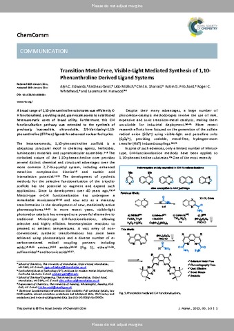 Edwards, A. C., Geist, A., Müllich, U., Sharrad, C. A., Pritchard, R. G., Whitehead, R. C. and Harwood, L. M. orcid id iconORCID: https://orcid.org/0000-0002-8442-7380 (2017) Transition metal-free, visible-light mediated synthesis of 1,10-phenanthroline derived ligand systems. Chemical Communications, 53 (58). pp. 8160-8163. ISSN 1359-7345 doi: 10.1039/c7cc03903d