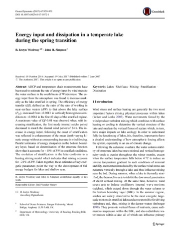 ADCP and temperature chain measurements have been used to estimate the rate of energy input by wind stress to the water surface in the south basin of Windermere. The energy input from the atmosphere was found to increase markedly as the lake stratified in spring. The efficiency of energy transfer (Eff), defined as the ratio of the rate of working in near-surface waters (RW) to that above the lake surface (P10), increased from ∼0.0013 in vertically homogenous conditions to ∼0.0064 in the first 40 days of the stratified regime. A maximum value of Eff∼0.01 was observed when, with increasing stratification, the first mode internal seiche period decreased to match the diurnal wind period of 24 h. The increase in energy input, following the onset of stratification was reflected in enhancement of the mean depth-varying kinetic energy without a corresponding increase in wind forcing. Parallel estimates of energy dissipation in the bottom boundary layer, based on determination of the structure function show that it accounts for ∼15% of RW in stratified conditions. The evolution of stratification in the lake conforms to a heating stirring model which indicates that mixing accounts for ∼21% of RW. Taken together, these estimates of key energetic parameters point the way to the development of full energy budgets for lakes and shallow seas.