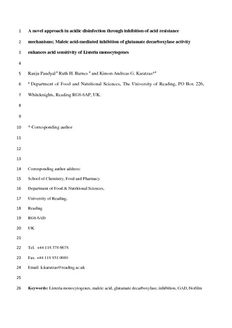 Paudyal, R., Barnes, R. H. and Karatzas, K. A. G. (2018) A novel approach in acidic disinfection through inhibition of acid resistance mechanisms; Maleic acid-mediated inhibition of glutamate decarboxylase activity enhances acid sensitivity of Listeria monocytogenes. Food Microbiology, 69. pp. 96-104. ISSN 0740-0020 doi: 10.1016/j.fm.2017.07.013