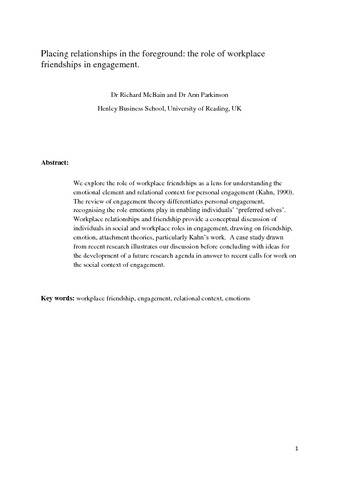 We explore the role of workplace friendships as a lens for understanding the emotional element and relational context for personal engagement (Kahn, 1990). The review of engagement theory differentiates personal engagement, recognising the role emotions play in enabling individuals’ ‘preferred selves’. Workplace relationships and friendship provide a conceptual discussion of individuals in social and workplace roles in engagement, drawing on friendship, emotion, attachment theories, particularly Kahn’s work. A case study drawn from recent research illustrates our discussion before concluding with ideas for the development of a future research agenda in answer to recent calls for work on the social context of engagement.