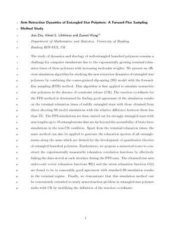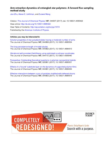 Zhu, J., Likhtman, A. E. and Wang, Z. (2017) Arm retraction dynamics of entangled star polymers: a forward-flux sampling method study. The Journal of Chemical Physics, 147 (4). 044907. ISSN 0021-9606 doi: 10.1063/1.4995422