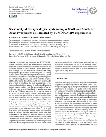 Hasson, S., Lucarini, V. orcid id iconORCID: https://orcid.org/0000-0001-9392-1471, Pascale, S. and Böhner, J. (2014) Seasonality of the hydrological cycle in major South and Southeast Asian river basins as simulated by PCMDI/CMIP3 experiments. Earth System Dynamics, 5 (1). pp. 67-87. ISSN 2190-4987 doi: 10.5194/esd-5-67-2014