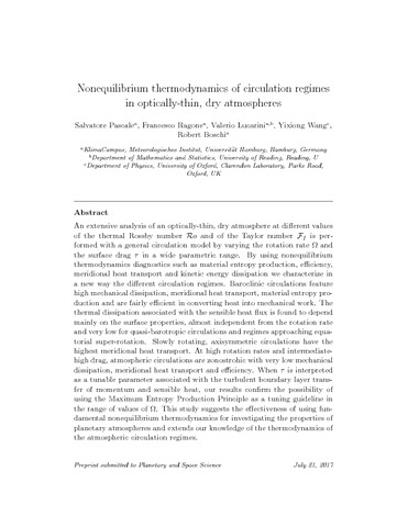 Nonequilibrium thermodynamics of circulation regimes in optically thin, dry atmospheres.