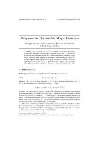 Jaming, P., Lyubarskii, Y., Malinnikova, E. and Perfekt, K.-M. (2018) Uniqueness for discrete Schrödinger evolutions. Revista Matemática Iberoamericana, 34 (3). pp. 949-966. ISSN 0213-2230 doi: 10.4171/rmi/1011