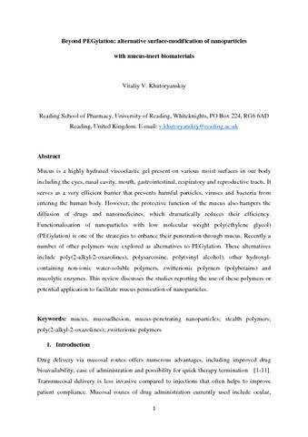 Khutoryanskiy, V. V. orcid id iconORCID: https://orcid.org/0000-0002-7221-2630 (2018) Beyond PEGylation: alternative surface-modification of nanoparticles with mucus-inert biomaterials. Advanced Drug Delivery Reviews, 124. pp. 140-149. ISSN 0169-409X doi: 10.1016/j.addr.2017.07.015