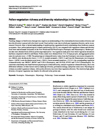Gosling, W. D., Julier, A. C.M., Adu-Bredu, S., Djagbletey, G. D., Fraser, W. T., Jardine, P. E., Lomax, B. H., Malhi, Y., Manu, E. A., Mayle, F. E. orcid id iconORCID: https://orcid.org/0000-0001-9208-0519 and Moore, S. (2018) Pollen-vegetation richness and diversity relationships in the tropics. Vegetation History & Archaeobotany, 27 (2). pp. 411-418. ISSN 1617-6278 doi: 10.1007/s00334-017-0642-y