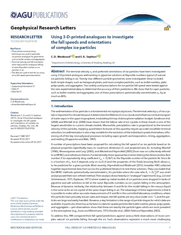 Westbrook, C. D. orcid id iconORCID: https://orcid.org/0000-0002-2889-8815 and Sephton, E. K. (2017) Using 3D-printed analogues to investigate the fall speeds and orientations of complex ice particles. Geophysical Research Letters, 44 (15). pp. 7994-8001. ISSN 0094-8276 doi: 10.1002/2017gl074130