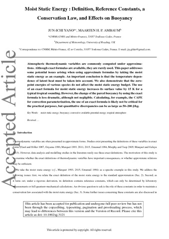 Moist static energy: definition, reference constants, a conservation law, and effects on buoyancy.