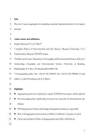Fukumasu, J. and Shaw, L. (2017) The role of macro-aggregation in regulating enzymatic depolymerization of soil organic nitrogen. Soil Biology and Biochemistry, 115. pp. 100-108. ISSN 0038-0717 doi: 10.1016/j.soilbio.2017.08.008