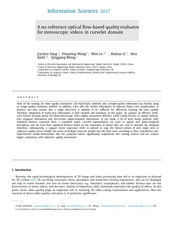 Yang, J., Wang, H., Lu, W., Li, B., Badii, A. and Meng, Q. (2017) A no-reference optical flow-based quality evaluator for stereoscopic videos in curvelet domain. Information Sciences, 414. pp. 133-146. ISSN 0020-0255 doi: 10.1016/j.ins.2017.05.051