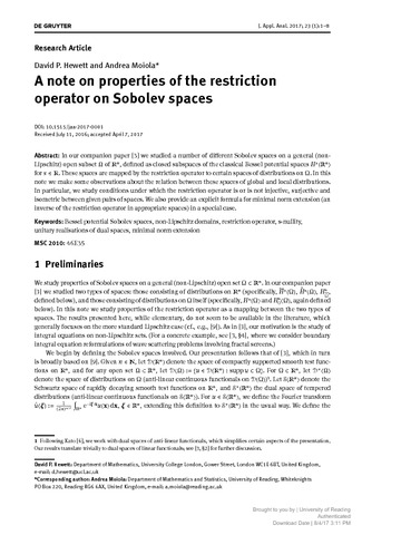 Hewett, D. P. and Moiola, A. (2017) A note on properties of the restriction operator on Sobolev spaces. Journal of Applied Analysis, 23 (1). pp. 1-8. ISSN 1425-6908 doi: 10.1515/jaa-2017-0001