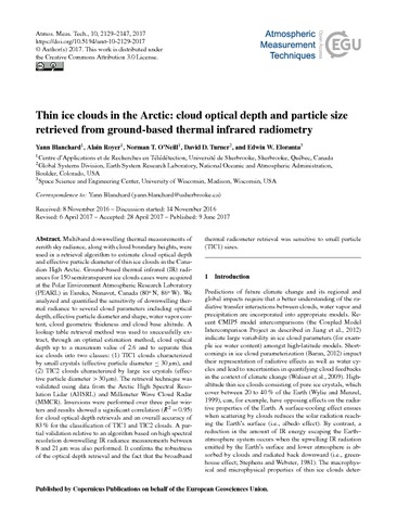 Blanchard, Y., Royer, A., O'Neill, N. T., Turner, D. D. and Eloranta, E. W. (2017) Thin ice clouds in the Arctic: cloud optical depth and particle size retrieved from ground-based thermal infrared radiometry. Atmospheric Measurement Techniques, 10 (6). pp. 2129-2147. ISSN 1867-8548 doi: 10.5194/amt-10-2129-2017