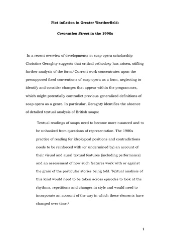 This article outlines the substantial changes in production practice undergone by the long-running series Coronation Street between the late 1980s and late 1990s and attempts to explain how these changes affected the form of the programme. Coronation Street underwent two concurrent moments of change in 1989, transmitting three episodes a week, as opposed to two, and recording location scenes on videotape instead of on 16mm film. This change in recording technology enabled the programme to use many more exterior scenes than previously, creating a more mobile mise-en-scene. This expansion of the show’s fictional world was part of a conscious decision to change the programme’s style in order to utilize the opportunities created by the extra episode, introducing more characters and including more (much shorter) scenes. I investigate the effects that these changes had on Coronation Street, both in terms of the programme’s plot (the phenomenally popular storyline of Alan Bradley’s deranged pursuit of Rita Sullivan) and audience reception. The changes effected upon Coronation Street in 1989 were the start of a trend (termed “plot inflation” by Graham Kibble-White), towards more spectacular storylines realized in striking visual images, that can be seen to advance throughout the 1990s, enabled in particular through the innovation of recording interior scenes on a single camera and necessitated by the further expansion into four episodes a week in 1996. This article combines analysis of technological development, the commercial circumstances of production and textual analysis, to form a fully rounded understanding of the changes that affected ITV drama in the 1990s.