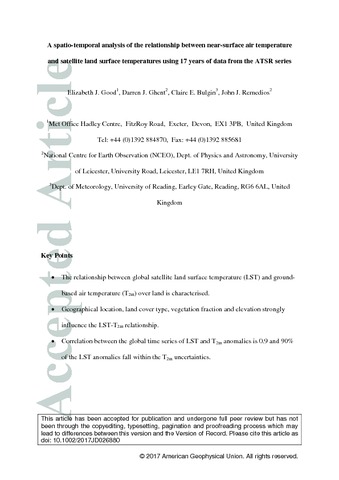 Good, E. J., Ghent, D. J., Bulgin, C. E. orcid id iconORCID: https://orcid.org/0000-0003-4368-7386 and Remedios, J. J. (2017) A spatiotemporal analysis of the relationship between near-surface air temperature and satellite land surface temperatures using 17 years of data from the ATSR series. Journal of Geophysical Research: Atmospheres, 122 (17). pp. 9185-9210. ISSN 2169-8996 doi: 10.1002/2017JD026880
