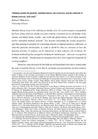 Blakemore, R. J. orcid id iconORCID: https://orcid.org/0000-0002-0281-6826 (2014) Thinking outside the gundeck: maritime history, the royal navy and the outbreak of British civil war, 1625–42. Historical Research, 87 (236). pp. 251-274. ISSN 0950-3471 doi: 10.1111/1468-2281.12049