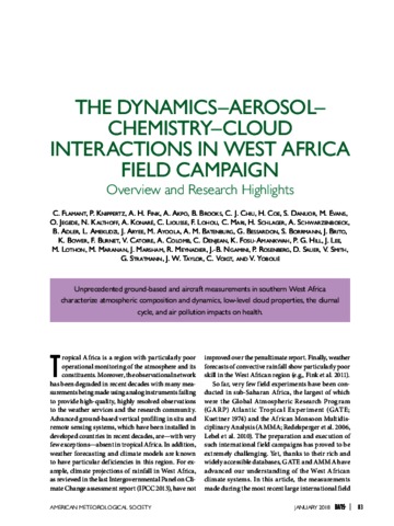 Flamant, C., Knippertz, P., Fink, A. H., Akpo, A., Brooks, B., Chiu, C. J., Coe, H., Danuor, S., Evans, M., Jegede, O., Kalthoff, N., Konaré, A., Liousse, C., Lohou, F., Mari, C., Schlager, H., Schwarzenboeck, A., Adler, B., Amekudzi, L., Aryee, J., Ayoola, M., Batenburg, A. M., Bessardon, G., Borrmann, S., Brito, J., Bower, K., Burnet, F., Catoire, V., Colomb, A., Denjean, C., Fosu-Amankwah, K., Hill, P. G. orcid id iconORCID: https://orcid.org/0000-0002-9745-2120, Lee, J., Lothon, M., Maranan, M., Marsham, J., Meynadier, R., Ngamini, J.-B., Rosenberg, P., Sauer, D., Smith, V., Stratmann, G., Taylor, J. W., Voigt, C. and Yoboué, V. (2018) The Dynamics-Aerosol-Chemistry-Cloud Interactions in West Africa field campaign: overview and research highlights. Bulletin of the American Meteorological Society, 99 (1). pp. 83-104. ISSN 1520-0477 doi: 10.1175/BAMS-D-16-0256.1