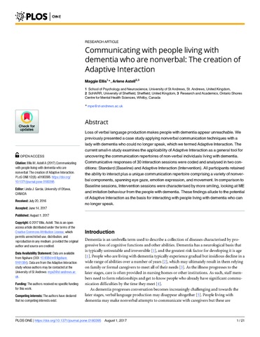 Ellis, M. and Astell, A. orcid id iconORCID: https://orcid.org/0000-0002-6822-9472 (2017) Communicating with people living with dementia who are nonverbal: the creation of Adaptive Interaction. PLoS ONE, 12 (8). e0180395. ISSN 1932-6203 doi: 10.1371/journal.pone.0180395