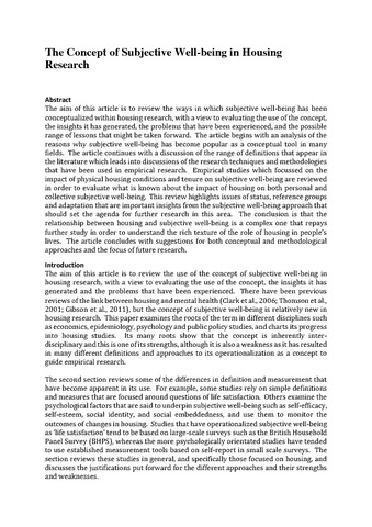 The aim of this article is to review the ways in which subjective well-being has been conceptualized within housing research, with a view to evaluating the use of the concept, the insights it has generated, the problems that have been experienced and the possible range of lessons that might be taken forward. The article begins with an analysis of the reasons why subjective well-being has become popular as a conceptual tool in many fields. The article continues with a discussion of the range of definitions that appear in the literature which leads into discussions of the research techniques and methodologies that have been used in empirical research. Empirical studies which focussed on the impact of physical housing conditions and tenure on subjective well-being are reviewed in order to evaluate what is known about the impact of housing on both personal and collective subjective well-being. This review highlights issues of status, reference groups and adaptation that are important insights from the subjective well-being approach that should set the agenda for further research in this area. The conclusion is that the relationship between housing and subjective well-being is a complex one that repays further study in order to understand the rich texture of the role of housing in people’s lives. The article concludes with suggestions for both conceptual and methodological approaches and the focus of future research.