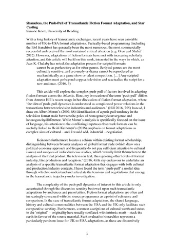 Knox, S. orcid id iconORCID: https://orcid.org/0000-0002-5094-6203 (2018) Shameless, the push-pull of transatlantic fiction format adaptation, and star casting. New Review of Film and Television Studies, 16 (3). pp. 295-323. ISSN 1740-7923 doi: 10.1080/17400309.2018.1487130