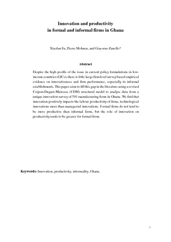 Despite the high profile of the issue in current policy formulations in low-income countries (LICs), there is little large firm level survey based empirical evidence on innovativeness and firm performance, especially in informal establishments. This paper aims to fill this gap in the literature using a revised Crépon-Duguet-Mairesse (CDM) structural model to analyse data from a unique innovation survey of 501 manufacturing firms in Ghana. We find that innovation positively impacts the labour productivity of firms, technological innovations more than managerial innovations. Formal firms do not tend to be more productive than informal firms, but the role of innovation on productivity tends to be greater for formal firms.