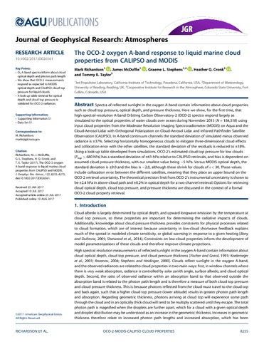 Richardson, M., McDuffie, J., Stephens, G. L., Cronk, H. Q. and Taylor, T. E. (2017) The OCO-2 oxygen A-band response to liquid marine cloud properties from CALIPSO and MODIS. Journal of Geophysical Research: Atmospheres, 122 (15). pp. 8255-8275. ISSN 2169-8996 doi: 10.1002/2017jd026561