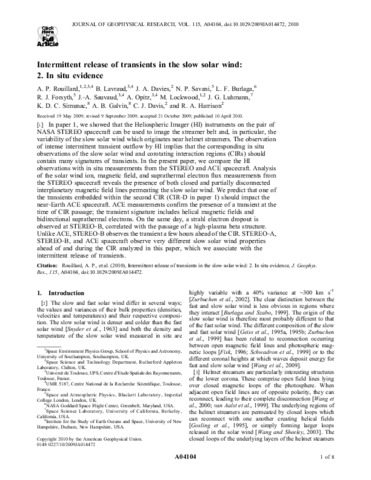 Rouillard, A. P., Lavraud, B., Davies, J. A., Savani, N. P., Burlaga, L. F., Forsyth, R. J., Sauvaud, J.-A., Opitz, A., Lockwood, M. orcid id iconORCID: https://orcid.org/0000-0002-7397-2172, Luhmann, J. G., Simunac, K. D. C., Galvin, A. B., Davis, C. J. orcid id iconORCID: https://orcid.org/0000-0001-6411-5649 and Harrison, R. A. (2010) Intermittent release of transients in the slow solar wind: 2. In situ evidence. Journal of Geophysical Research, 115. A04104. ISSN 0148-0227 doi: 10.1029/2009JA014472