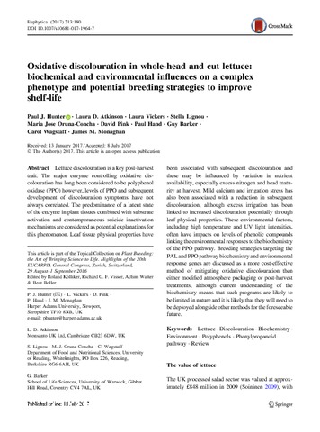 Lettuce discolouration is a key post-harvest trait. The major enzyme controlling oxidative discolouration has long been considered to be polyphenol oxidase (PPO) however, levels of PPO and subsequent development of discolouration symptoms have not always correlated. The predominance of a latent state of the enzyme in plant tissues combined with substrate activation and contemporaneous suicide inactivation mechanisms are considered as potential explanations for this phenomenon. Leaf tissue physical properties have been associated with subsequent discolouration and these may be influenced by variation in nutrient availability, especially excess nitrogen and head maturity at harvest. Mild calcium and irrigation stress has also been associated with a reduction in subsequent discolouration, although excess irrigation has been linked to increased discolouration potentially through leaf physical properties. These environmental factors, including high temperature and UV light intensities, often have impacts on levels of phenolic compounds linking the environmental responses to the biochemistry of the PPO pathway. Breeding strategies targeting the PALand PPOpathway biochemistry and environmental response genes are discussed as a more cost-effective method of mitigating oxidative discolouration then either modified atmosphere packaging or post-harvest treatments, although current understanding of the biochemistry means that such programs are likely to be limited in nature and it is likely that they will need to be deployed alongside other methods for the foreseeable future.